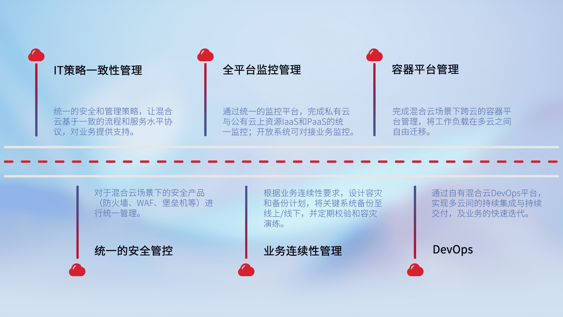 通过多云纳管,,以统一的资源数据模型把客户的云资源进行抽象和封装,,,,进而实现对多云资源的统一操作,,,保障云资源管理的可靠性、、、、稳定性与可用性。。。量身定制化运维内容,,配置、、开发运维、、、、补丁管理、、备份、、、监控、、、、认证和访问管理、、审计和日常巡检等,,保障在用云过程中的可靠度,,稳定度以及高可用率。。。。
