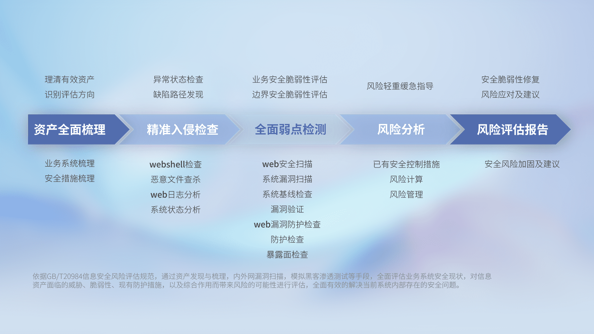 针对客户行业特性,,,,以专业的安全服务+多厂商联合解决方案提供专属的一站式安全管理服务,,,,帮助客户全面感知网络空间威胁,,,,基于识别、、、、检测、、、分析、、、、防护、、监测、、响应的服务理论模型,,,从方案咨询、、、、集成交付、、评估验证、、、、优化加固、、运维运营,,,,致力于为客户提供完整的闭环管理式安全服务。。。。以实战经验为客户打造高抵御风险的安全体系,,,帮助客户发现威胁、、、、对抗威胁、、、处置威胁,,,不断积累安全对抗能力,,,,持续保障数字化安全。。。。